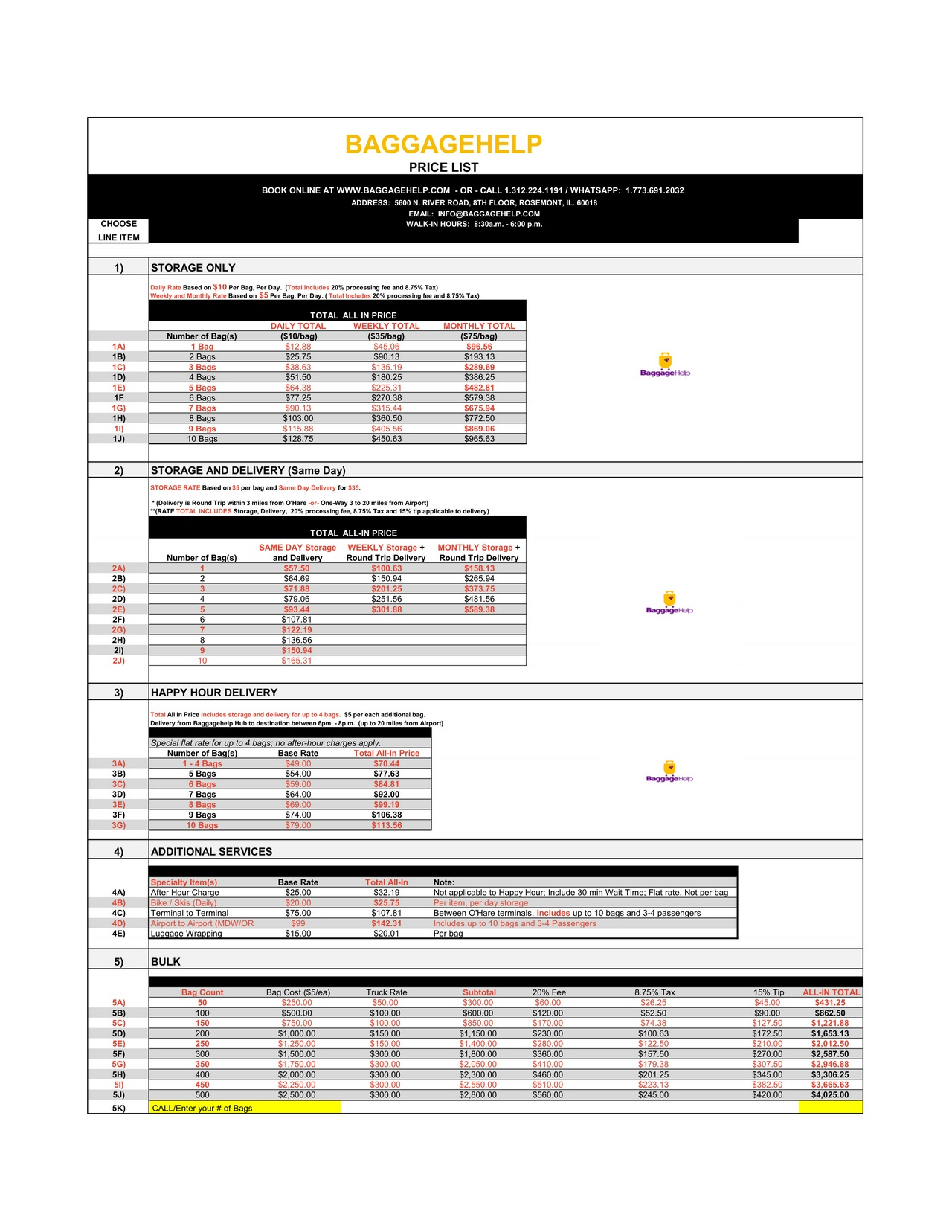 Thank you for choosing BaggageHelp! We have officially updated our price list for all luggage handling and storage services to better serve your travel needs. Click the link below to see how we can simplify your next trip and keep you hands-free. We continue to accept both cash and credit for your convenience. Traveling with a crowd? Please call us directly for specialized pricing on group requests! Check out the updated rates now